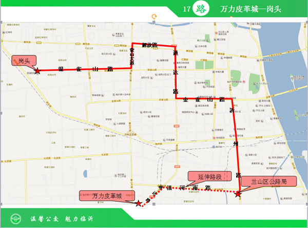 17路由终点站由兰山区公路局延伸至万力皮革城。延伸后17路由万力皮革城运行至岗头,途经通达路、清河南路、沂州路、金雀山路、通达路、解放路、蒙山大道、银雀山路。延伸后该线路增加公交站点5处:首创水务公司、施可丰化工、陈白庄社区东区、陈白庄、罗庄零工市场。实行非空调车票价,投币1元,刷卡0.7元。