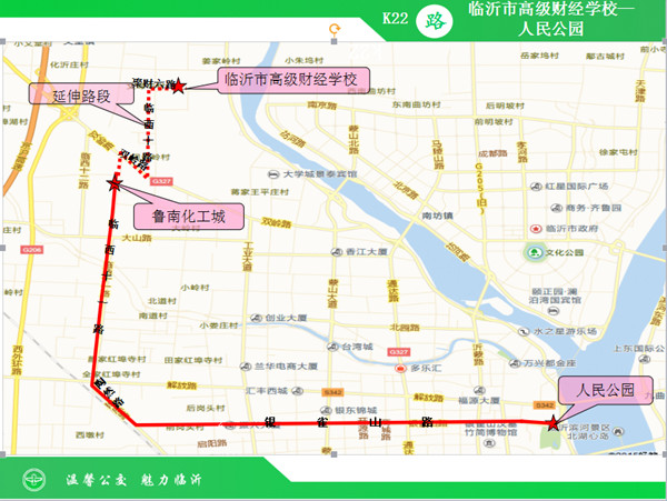 K22路终点站由鲁南化工城延伸至临沂市高级财经学校。延伸后K22路由人民公园运行至临沂市高级财经学校,途经银雀山路、陶然路、临西十一路、双岭路、临西十路、聚才六路。延伸后该线路增加公交站点5处:鲁南化工城北门、砚台岭、砚台岭社区、砚台岭社区服务中心、临沂市高级财经学校。实行空调车票价,投币2元,刷卡1.4元。