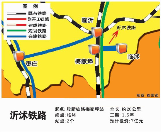 沂沭铁路位于临沂市境内,线路自胶新铁路梅家埠站接轨,经临沂市经济技术开发区至临沭,正线全长约20公里。沂沭铁路2013年5月开工,中铁十局科学组织施工,强化现场管理,严格过程控制,加班加点艰苦奋战,确保工程顺利推进。目前主要剩余工作量为临沭站货物站台、区间线路补碴等工程量。