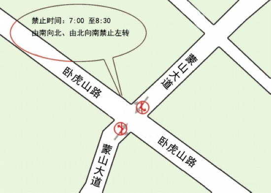 蒙山大道是南北贯穿临沂城区的主要干道之一,承担着北城新区、兰山主城区及罗庄的大部分交通流量加之蒙山大道(聚才路与金雀山路段)又地处市区繁华路段居民区、酒店、商业服务等设施比较多,机动车、非机动车及行人等交通元素较多,为了最大限度的满足各种交通出行方式对道路的交通需求,切实提高高峰期间此路口的道路通行水平,交警支队通对蒙山大道与卧虎山路路口各个方向进行了详细的交通流量调查后,决定11月16日起,对该路口不同方向的交通流实行限时禁左等交通管理措施,具体管制如下:7:00 至8:30 蒙山大道与卧虎山路路口禁止车辆由南向北、由北向南左转弯;16:30 至 19:00 蒙山大道、卧虎山路路口禁止车辆由南向北、由北向南、由东向西以及由西向东左转弯。沿线出行的市民可根据交通需求及时间,合理安排出行路线优先选择道路通行,切实减少道路交通冲突,提高道路的通行效率。