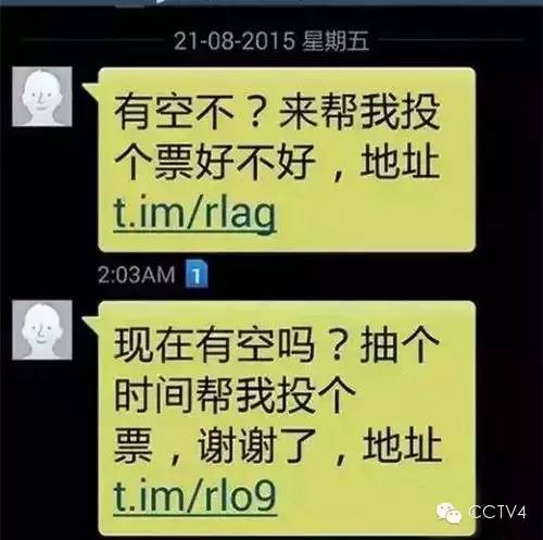 最近,很多人都可能收到自己朋友发来的短信:“有空吗?帮我投下票好吗?地址t.i.m/rlag”。