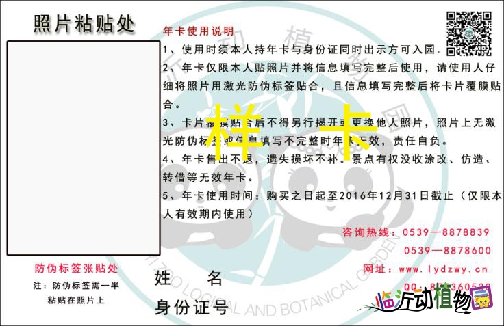 临沂动植物园2016版旅游年卡,采用PVC材料,照片处采用铣槽,使用时直接将照片放入槽中,贴防伪帖,完整覆膜后方可使用。年卡为单人卡,价格为60元。年卡有效期自2016年1月1日到2016年12月30日。办卡时需要办卡人携带本人2张1寸近期免冠照片和身份证,联系电话0539-8878839。