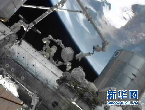 7月12日,来自美国宇航局(NASA)的电视画面显示,“阿特兰蒂斯”号航天飞机宇航员迈克·福萨姆出舱行走执行故障液氨泵回收任务。美国航天局12日宣布,国际空间站两名美国宇航员当天出舱进行太空行走,回收了一个故障液氨泵。这是美国航天飞机时代的最后一次太空行走。 新华社/路透