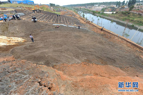 8月14日,一些工人正在清理、整治化工厂堆积在南盘江畔的铬渣山。