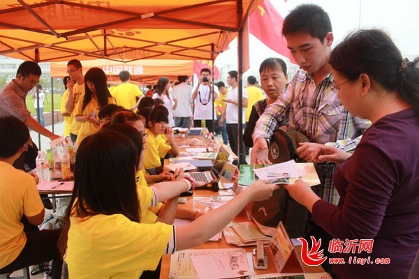 临沂大学志愿者为新生办理报道手续。