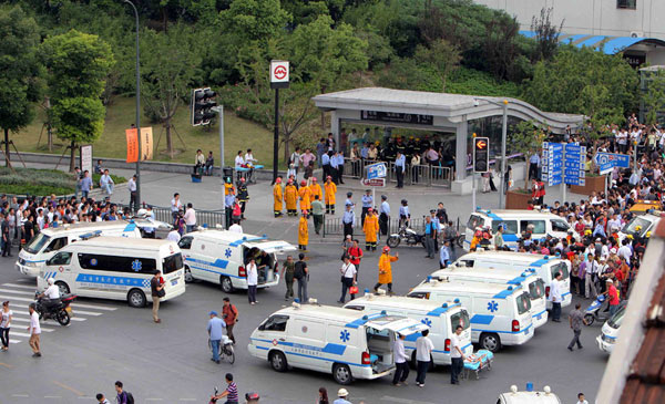 (9月27日,多辆救护车等待在十号线豫园站外。)