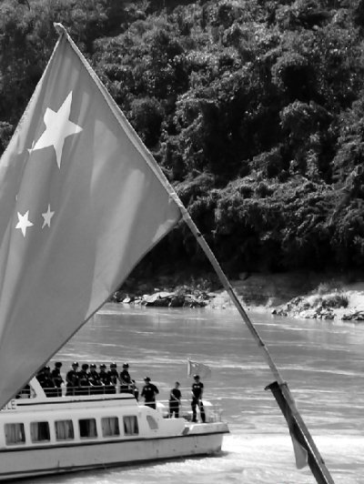 昨日上午,西双版纳州公安局水上分局派出巡逻艇从关累港出境,顺湄公河而下,接应滞留的中方船员及船只回国。图/吴德昌