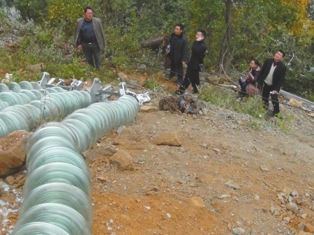 从官地电站入口处行车20多分钟后,站在公路往山上望去,陡峭的山坡上,并排直立着3座输电铁塔。位于山顶最高处的第三座输电铁塔,像是被拦腰截断,倒了下来,被树丛掩盖,只剩下地面上的小半截。