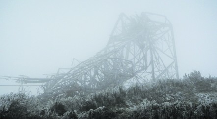 ●巨大的铁塔从中间弯折,向着山下的方向,斜着倾倒在地
