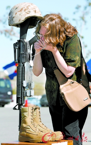 2007年2月15日,在美国加利福尼亚,一名妇女参加为在伊拉克丧生的美兵举行的悼念仪式时亲吻儿子的身份牌。