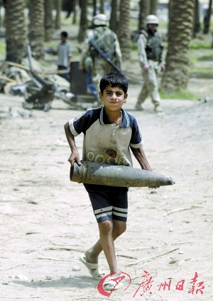 童年 2003年5月19日,一名伊拉克儿童在巴格达搬运一枚未爆炸的美军炮弹。