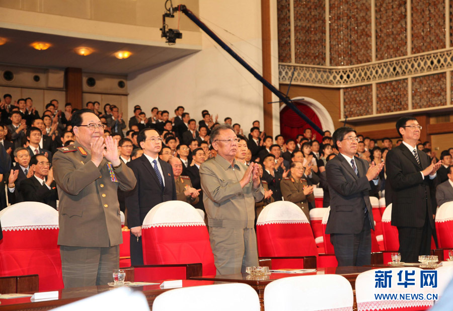 7月15日,在朝鲜平壤万寿台艺术剧院,朝鲜最高领导人金正日(左二)、中国驻朝鲜大使刘洪才(右二)等在中国舞剧《丝路花雨》演出结束时鼓掌。朝鲜最高领导人金正日当日在平壤万寿台艺术剧院观看了中国甘肃歌剧舞剧院的舞剧《丝路花雨》。为纪念《中朝友好合作互助条约》签订50周年,《丝路花雨》剧组于7月7日至16日到朝鲜访问演出。新华社记者张利摄