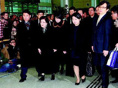 12月26日,韩国已故前总统金大中的夫人李姬镐(前左二)和已故现代集团前会长郑梦宪的夫人玄贞恩(前右二),前往平壤吊唁金正日新华社发