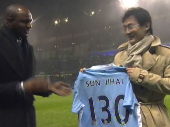 随后,传奇球星维埃拉走上前来与孙继海亲切握手,并献上了印有“SUN JIHAI”几个大字的130号曼城球衣,“中国SUN”微笑着接过球衣,并与维埃拉一起在现场47131名球迷以及数亿电视机前的观众面前展示了自己的荣誉战袍,掌声欢呼声再一次交织在一起,响彻曼彻斯特的天空!这一刻,让无数中国球迷动容落泪……