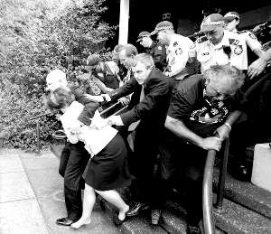 吉拉德和阿博特26日下午一道出席活动,嘉奖救灾人员。其间,大约50名原先在酒店附近示威的原住民向酒店围拢并高喊口号。在保镖和警方人员护送下,吉拉德和阿博特离开会场,乘车而去。
