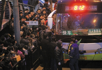 候车乘客打乱队形争上车