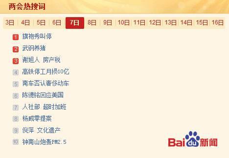 中新网3月7日电2012年全国“两会”正在进行中,在代表委员们继续就各自关注的议题阐述主张的同时,会场内外的一些趣闻花絮亦为媒体争相报道。百度新闻热搜榜提供的数据显示,旗袍秀叫停、武钢养猪、房产税、钟南山炮轰PM2.5分区域监测、超时加班等成为今日最受网友关注的话题。