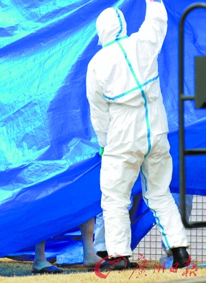 2011年3月25日的照片显示,一名在日本福岛第一核电站遭受过量辐射的工作人员(左边穿拖鞋者)接受去污治疗后在防护罩的保护下回到福岛县医科大学附属医院。 (资料照片)