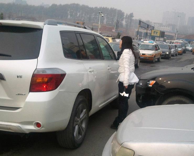 2013年10月20日11时许,在长春欧亚卖场十号门外的停车场通道里,一名年轻女子驾驶一辆灰色丰田轿车由东向西行驶,与一辆由西向东行驶的白色丰田越野车迎面会车。越野车没有避让,往前抢了一下,险造成两车刮碰。女子停车后下车和越野车司机理论,还从车里拿出了一把刃口明晃晃的斧子,一手持斧子,一手不停拍打对方右前侧车门,并且和对方争吵。当时双方车上都有老人,而越野车里还有孩子,吓得哇哇直哭,越野车司机怕出事,就一直没下车也没开车窗。