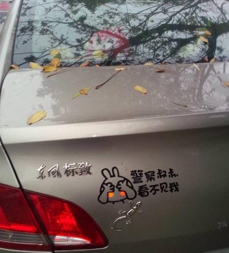 时下拥有私家车的人越来越多,汽车屁股上贴标语也成为街头时尚。无处不在的堵车滋生了司机的烦躁情绪,而张贴在车后窗的个性标语,在给人带来快乐之余,也能让车主们紧绷的神经松弛片刻,缩小了人与人之间的隔阂。各种逗趣、搞怪的车贴让人忍俊不禁,车贴成了马路上别样的风景。在行车、等红灯的间隙,稍微留意一下,我们便会发现很多车都贴着车贴,这些幽默话语、萌卡通,希望能在一定程度上能缓解司机在道路产生的焦躁请绪。