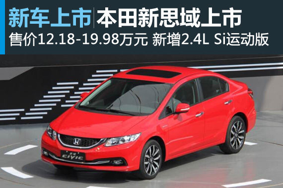 2014年6月27日,东风本田新款思域正式上市。新车搭载1.8L和2.4L发动机,其中1.8L发动机分5AT和5MT两款变速箱,共5款车型,售价为12.18-15.78万元。而搭载2.4L发动机的车型为Si版本,0到百公里/时加速仅需7.5秒,售价为19.98万元,该车将11月份到店销售。