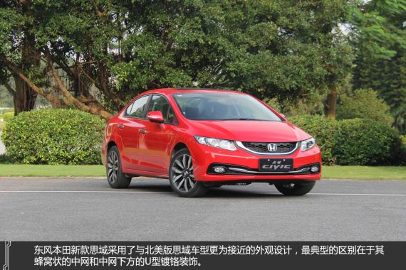 东风本田新款思域采用了北美版思域的造型,前进气格栅采用了U型镀铬装饰和蜂窝样式中网搭配的设计,下格栅和雾灯的造型也有所改变,虽然四边形的大灯造型没有改变,而新加入的透镜使前大灯看起来更加有型。车身侧面,新款思域沿用了老款思域的整体外观造型,并没有太大变化。车尾部,新思域的最大改变在于增加了镀铬装饰条。而全新推出的2.4L Si版本车型在新款思域1.8L高配版的外观基础上,加大了下格栅的尺寸,车尾添加了具有扰流效果的尾翼和类似赛车车尾的扩散器,极具攻击性。