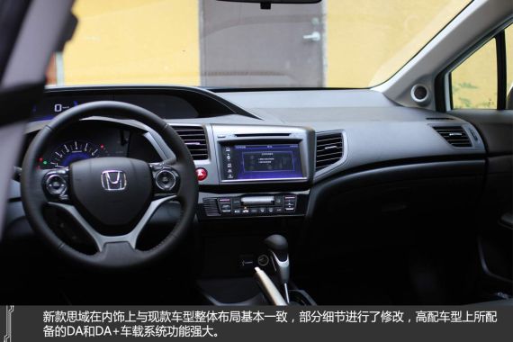 新款思域在内饰上没有太大的变化,中控面板依旧向驾驶者方向倾斜,双层的仪表设计、数字式仪表指针风格、液晶显示屏等设计依旧被继续沿用。而2.4L Si车型的内饰在1.8L高配车型的基础上对座椅进行了升级,采用红黑真皮座椅设计。 新款思域全系标配主副驾安全气囊、侧安全气囊、前排预紧式安全带、儿童安全座椅固定设备和ABS+EBD,除了1.8LLXi经典版手动挡和1.8L LXi经典版自动挡两款车型以外,其它车型还配备有倒车影像和和7英寸分辨率为1024×600的电容液晶显示屏,而最高配车型还配备了VSA车辆稳定性辅助系统。除去1.8L LXi经典版手动挡和1.8LLXi经典版自动挡两款车型以外,其他车型均配备电动天窗、智能钥匙、一键启动以及后排座椅40:60折叠。