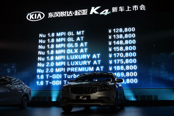 新浪汽车讯 东风悦达起亚于2014年9月1日晚在西安正式宣布旗下全新车型K4上市,共推出9款车型,售价12.88-18.98万元。新车搭载1.6T、1.8L和2.0L三款发动机,车内配置丰富。