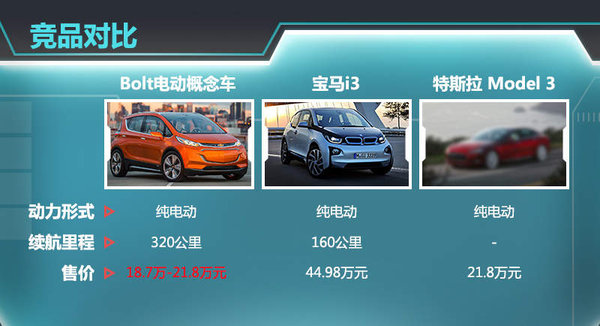 从售价上来看,Bolt的售价区间也要低于宝马i3(国内售:44.98万元)。根据此前消息,特拉斯将在2017年推出全新入门级电动车Model 3,预计售价在3.5万美元(约合21.8万人民币)。对比来看,雪佛兰Bolt在续航里程及售价方面均有一定竞争优势。
