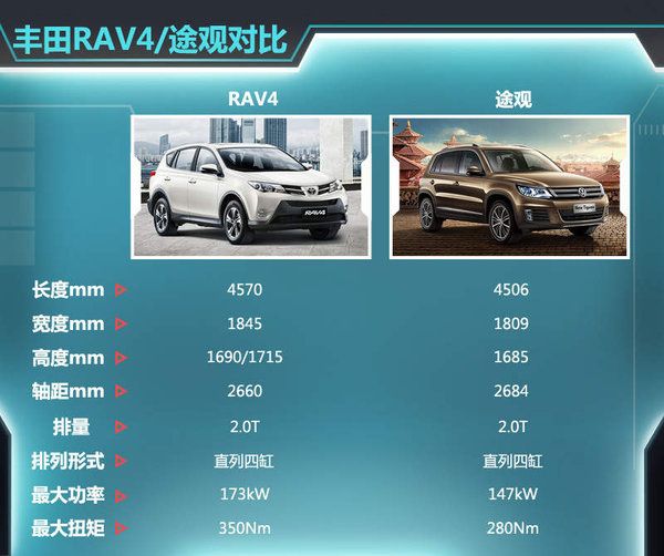 在目前紧凑型SUV市场中,大众途观以其稳定的市场表现长期占据合资品牌紧凑SUV榜首的位置,该车售价区间为19.98-31.58万元,轴距达到2684mm,动力上配备的是1.4T、1.8T和2.0T三款涡轮增压引擎。丰田RAV4搭载2.0T引擎后,动力输出更为强劲,并且还凭借售价、燃油经济性等优势,对途观市场份额发起挑战。