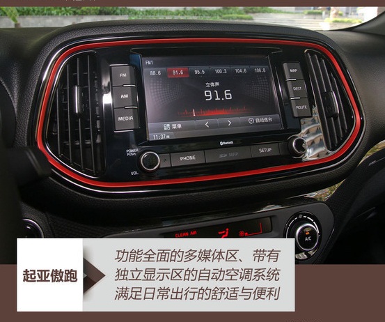 配置上,从目前获取的信息来看,起亚傲跑全系标配了前排双安全气囊、ABS+EBD、ISOFIX儿童安全座椅固定装置、LED高位刹车灯、黑色内饰、前排中央扶手、地图袋、外接电源、电动车窗、IGN锁车提醒等配置。
