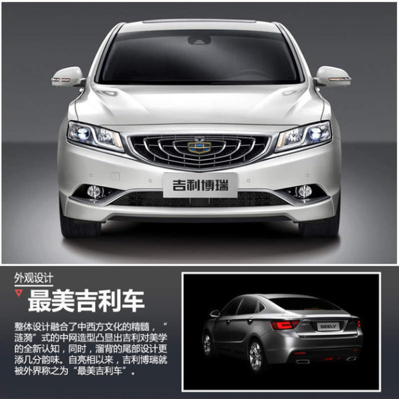 作为吉利品牌的全新旗舰车型,其稳重的造型受到诸多好评,吉利博瑞的设计语言已经为今后的吉利车型指明方向,全新的家族式设计是由中国上海、西班牙巴塞罗那、瑞典哥德堡以及美国加州四大造型设计中心倾力打造。整体设计融合了中西方文化的精髓,“涟漪”式的中网造型凸显出吉利对美学的全新认知,同时,溜背的尾部设计更添几许欧洲车的风韵。自亮相以来,吉利博瑞就被外界称之为“最美吉利车”。