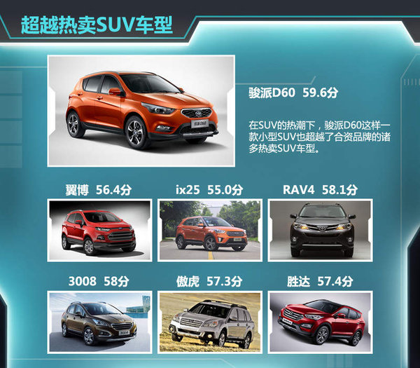 在C-NCAP碰撞的历史上,得分在骏派D60之上的只有观致3。在这二位身后,也有很多大家耳熟能详的五星选手,如历史销量4000万辆的卡罗拉,安全理念至上的沃尔沃V40,甚至还有你曾经考虑过的长安CS75。在SUV的热潮下,骏派D60这样一款小型SUV也超越了合资品牌的诸多热卖SUV车型。如小型SUV长安福特翼博,得分56.4分。北京现代ix25,得分55分。紧凑型SUV一汽丰田RAV4,得分58.1分。东风标致3008,得分58分。中型SUV斯巴鲁傲虎,得分57.3分。北京现代胜达,得分57.4分。