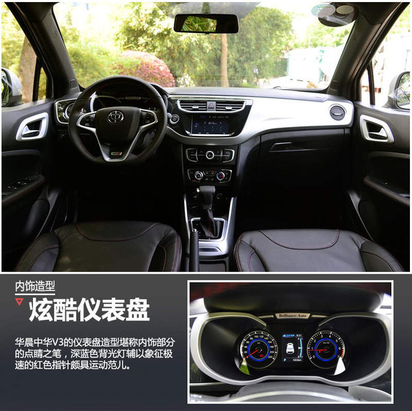 中华V3的内饰同样不乏亮点:双炮筒式仪表盘虽然并不新奇,但在深蓝色背光灯和象征极速的红色指针的共同映衬下,带来不错的显示效果。高度对称的中控台采用分层布局,并选用纯黑色调搭配银色饰板;空调出风口的镀铬装饰和下方功能按键控制区域相呼应,提升了内饰科技感和档次。