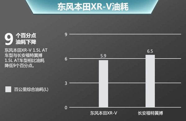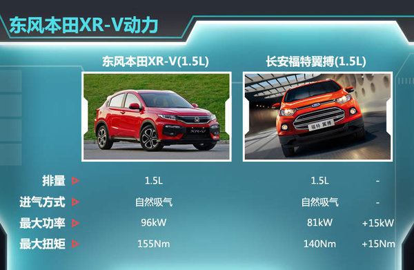 通过工信部公布的信息可知,XR-V 1.5L AT车型油耗为5.9L,而长安福特翼搏1.5L AT车型百公里综合油耗为6.5L,二者相比来看XR-V优势明显,用车成本得到大幅降低。而XR-V 1.5L MT车型油耗为6.1L,与长安福特翼搏1.5L MT车型相比同样具有优势。目前小排量发动机已经成为一种趋势,符合当下对于环保的要求,相信XR-V 1.5L车型会有较好的市场表现。