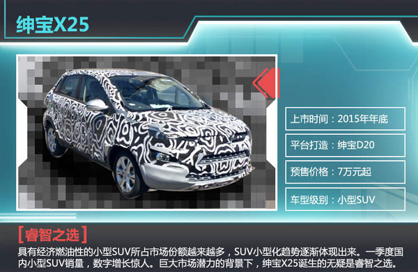 今年第一季度北京汽车销量相比去年,同比增长30.1%。作为最晚进入中国品牌阵营的北京汽车,经过上下4年奋力拼搏正逐步突出重围。为继续扩大市场优势,北京汽车规划推出全新车型绅宝X25。日前,网通社从北汽集团官方获悉:绅宝针对现阶段火热的小型SUV市场年底将推出绅宝X25,新车搭载1.5L自然吸气发动机,上市后将与哈弗H1抢夺市场。