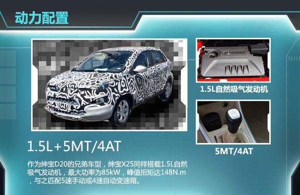 动力方面,作为绅宝D20的兄弟车型,绅宝X25同样搭载1.5L自然吸气发动机,最大功率为85kW,峰值扭矩达148N.m,与之匹配5速手动或4速自动变速箱。绅宝X25成熟动力配置的可靠性毋庸置疑,该车上市后将与哈弗H1抢夺市场。