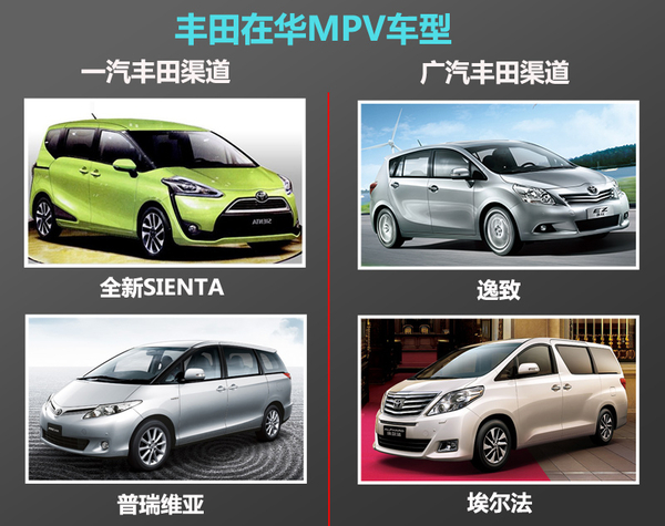 丰田目前在中国市场推出了三款MPV车型,分别是在广汽丰田销售的国产逸致以及进口埃尔法,还有一款在一汽丰田渠道销售的进口普瑞维亚,全新SIENTA定位与广汽丰田逸致相同,该车国产后将与逸致形成“组合拳”,共同冲击目前增速较快的MPV细分市场,以获得更大的市场份额。