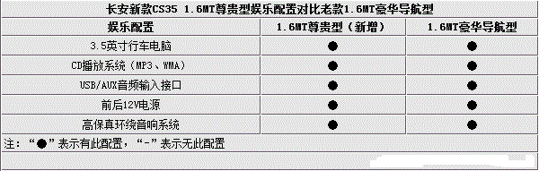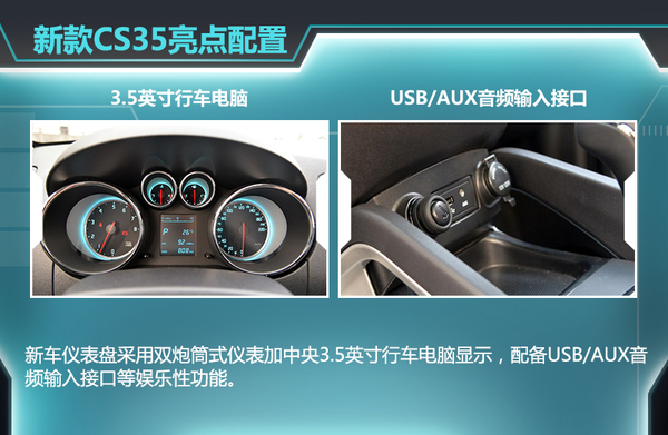 新款CS35 1.6MT尊贵型在娱乐配置方面则与老款1.6MT豪华导航型完全一致,提供3.5英寸行车电脑、CD播放系统、USB/AUX音频输入接口等常见的功能配置。整体而言,作为新款CS35的手动挡顶配车型,1.6MT尊贵型整体配置十分丰富,在售价提升2000元的前提下,较老款1.6MT豪华导航型增加了8项实用性配置,作为改款车型提供了足够多的变化,体现了厂家的诚意。