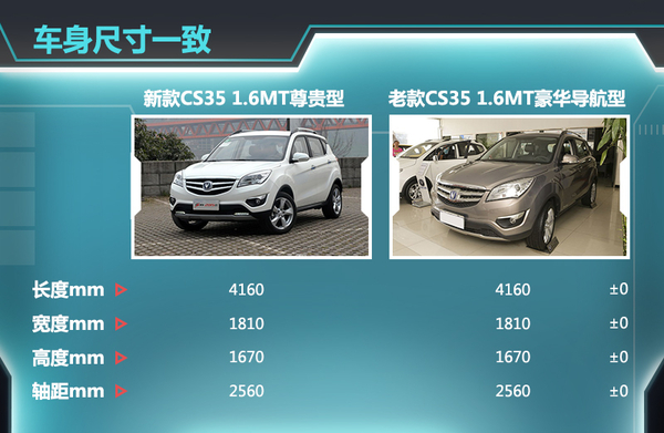 长安汽车旗下小型SUV——CS35,此前已推出搭载1.6L汽油发动机的6款车型,售价区间为7.89万-9.59万元。今年,长安又推出推出2015款CS35,新车共分为5款车型,售价区间为7.89万-9.79万元。网通社对比了新增的1.6MT尊贵型和老款1.6MT豪华导航型后发现,新车在售价提升2000元的前提下,新增了八项实用配置,此外两者在车身尺寸、动力参数等方面保持一致,下面我们就来仔细了解一下。