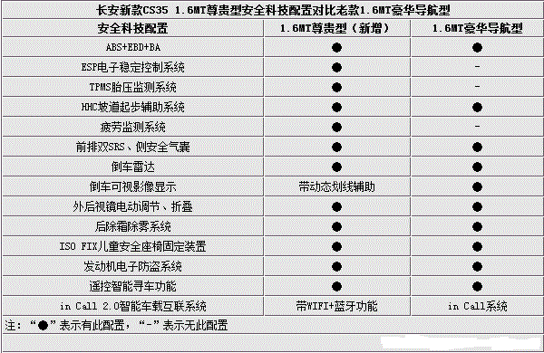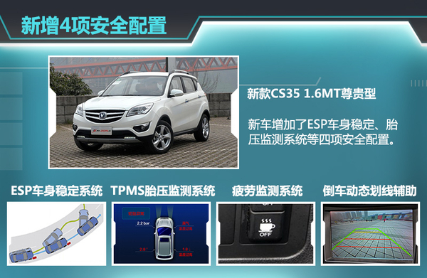 新款CS35 1.6MT尊贵型相比老款1.6MT豪华导航型最具亮点的升级就在于安全配置方面,新车配备了ESP车身稳定系统、TPMS胎压监测系统、疲劳监测系统等新功能,提升用户行车安全系数。此外倒车影像新增了动态划线辅助功能,呈现出更加直观的视觉效果方便用户预判倒车距离。此外新车还对车载交互系统进行了升级,新系统将支持WIFI+蓝牙连接功能,实用性能明显提升。