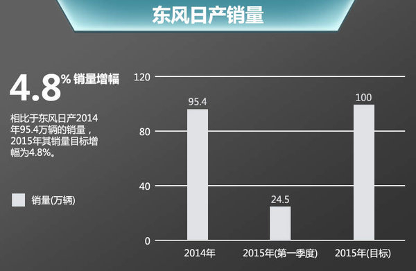 2014年,东风日产累计销量95.4万辆,较2013年增长3%,而2015年其销量目标则是100万辆,为了完成销量目标,东风日产对旗下现有车型进行更新换代,年内全新楼兰和逍客的投放以及蓝鸟的加入将为东风日产冲击100万销量奠定坚实的基础。