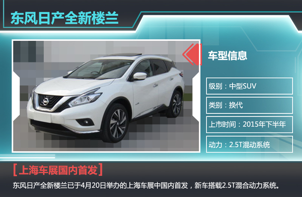 楼兰为东风日产旗下一款中型SUV,搭载3.5L自然吸气发动机,该车上市至今已有4年时间,其换代车型于今年四月举办的上海车展中国内首发,全新楼兰代表了日产最新的设计理念和产品技术。日前,网通社从东风日产官方了解到:全新楼兰将搭载2.5T机械增压油电混合动力系统,该车百公里综合油耗仅为8L,相比于现款楼兰3.5L传统动力车型油耗降低30%。