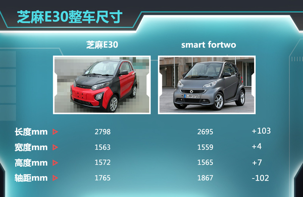 芝麻E30的整车尺寸十分紧凑,定位为一款A00级微型代步电动车,可满足城市年轻消费者城市的代步需求。新车的长宽高分别为2798·1563·1572mm,轴距为1765mm。与目前国内销售的知名时尚小车奔驰smart fortwo相近,两者间的尺寸不分伯仲。