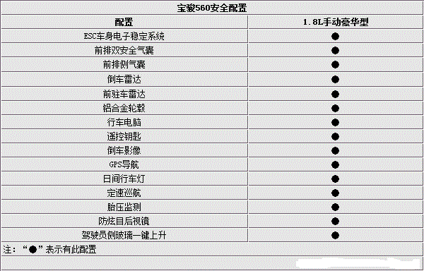 配置方面,宝骏560标配了ESC车身电子稳定系统、前排双安全气囊、倒车雷达、铝合金轮毂、行车电脑等。中配1.8L手动精英版配备了前排双侧气囊、8英寸触摸屏、倒车影像、定速巡航、蓝牙系统、手机映射功能、多功能方向盘等。顶配车型1.8L手动豪华版还配备了前驻车雷达、胎压监测、带加热和电动折叠功能车外后视镜、驾驶员侧玻璃一键上升、电动天窗、真皮换挡手柄、6向电动调节驾驶座、无钥匙进入、发动机一键启动以及GPS导航等。