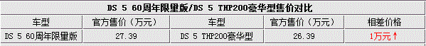 今年是DS品牌成立60周年,在此前的成都车展上DS已经亮相了纪念该品牌成立60周年的限量版DS 5、DS 5LS以及DS 6三款车型。近日,DS旗下三款60周年限量版车型正式上市,三款车共计限量666台。其中DS 5 60周年限量版车型售价27.39万,相比普通DS 5 THP200豪华版车型,除了车身外观标有60周年纪念特殊标识外,限量版车型还增加了11项专属配置,而售价仅高1万元。