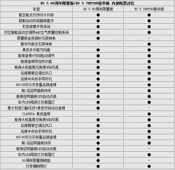 限量版出型相比普通版,在外观、内饰和安全各方面共增加了多处配置。其中外观方面,增加了DS品牌60周年限量版专属车标、与车身不同色的外后视镜以及限量版车型还将喷涂限量车型专属的香槟金珍珠漆。内饰方面,则配有60周年纪念专属座椅和脚垫,此外新车还配有限量版金色指针石英钟表。而安全配置方面,限量版车型增加了盲点监测系统和前泊车雷达。