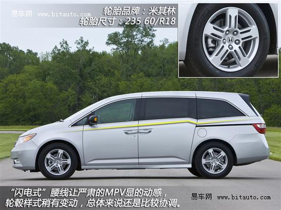 侧面的新造型无疑是亮点,新车使用了本田独有的“闪电式”腰线,让这款MPV车型一下变得非常运动,这也成为新车的一大区分标志。2011款美版奥德赛采用了稍稍改动的5辐式设计轮毂,米其林轮胎,规格为235/60 R18。