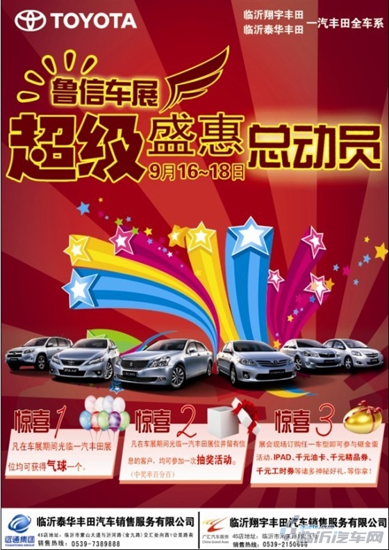 2011年临沂鲁信车展开展在即,一汽丰田两家4S店临沂泰华和临沂广汇翔宇店联袂送礼:一汽丰田汽车全车系盛惠总动员。如果您想购车,不妨去看看,相信这次的车展让利盛惠是空前的,绝对让您得到实惠。一汽丰田汽车在鲁信车展让您舒心、称心、放心。赶快行动吧!