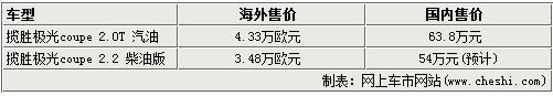 揽胜极光Evoque Coupe(三门版)为例,目前国内的预售价为63.8万元,而海外售价4.33万欧元,折合人民币为38万元,引入中国的加价率约为1.67,而揽胜极光Coupe(三门版)2.2 柴油版海外售价为3.48万欧元,依上述加价率推算其在国内的预售价约为54万元,要比2.0T车款便宜不少。